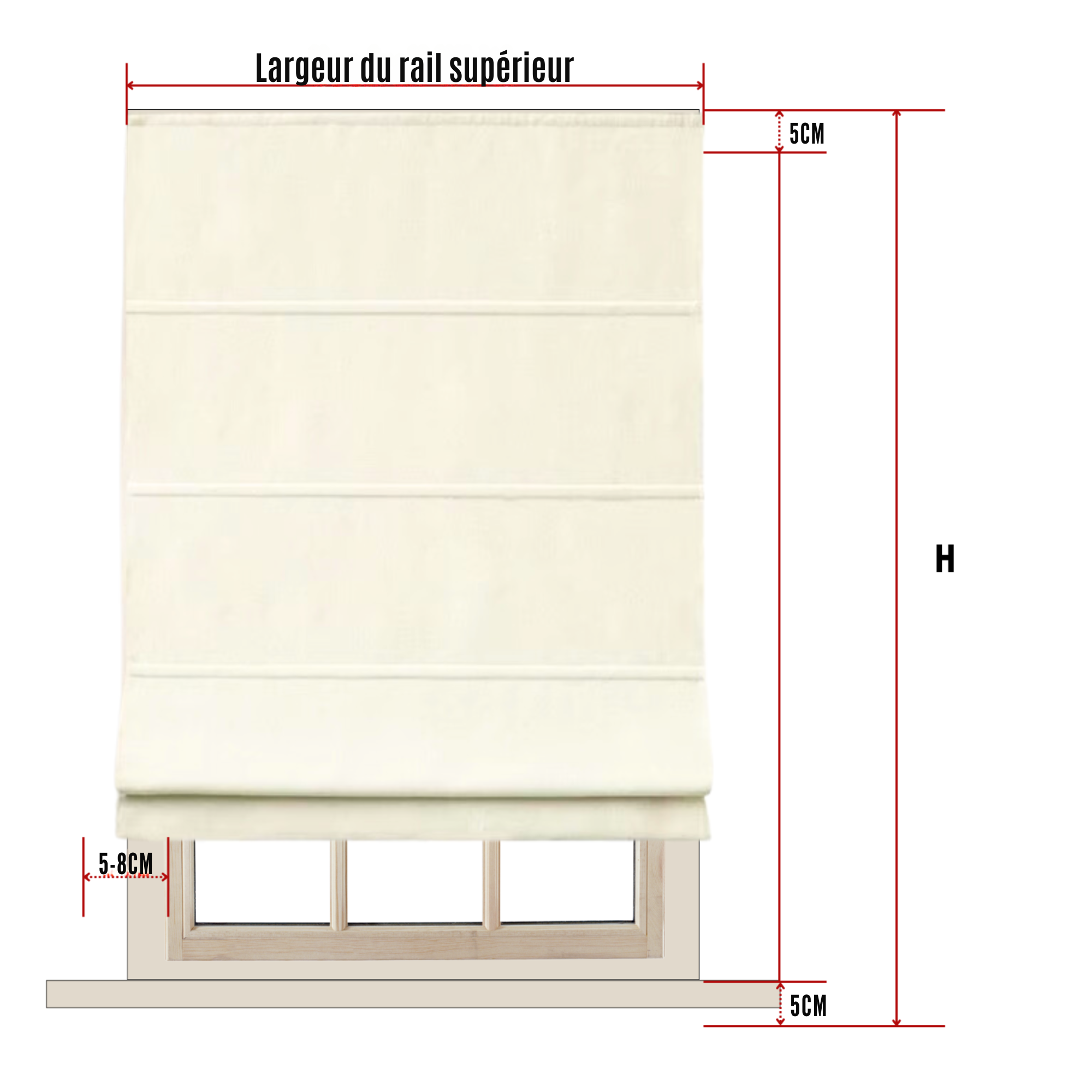 - Un chevauchement de 5 CM de chaque côté de la fenêtre est recommandé pour un contrôle de la lumière et de l'intimité optimal.