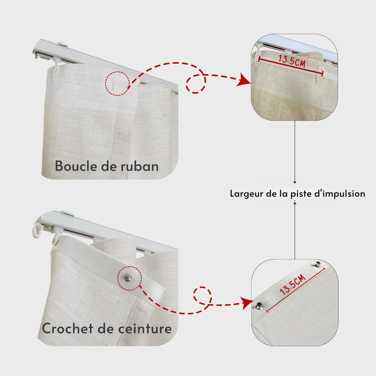 Nos rideaux à plis ondulés sont conçus pour correspondre à notre rail, dont l'espacement des chariots est de 8 cm par défaut. Si vous souhaitez utiliser votre propre rail, l'espacement des chariots peut être différent et ne pas correspondre.
