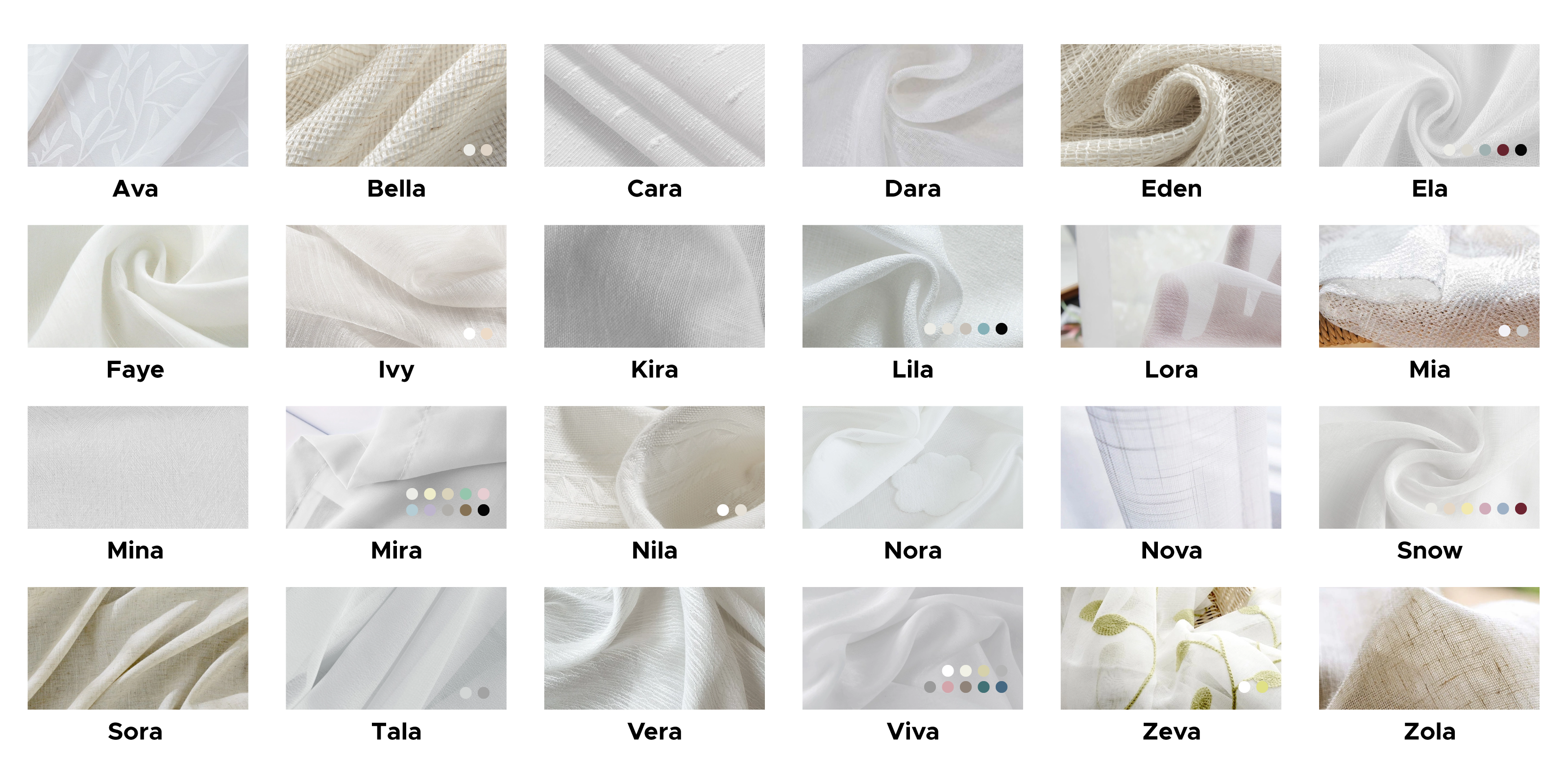 Le niveau d'opacité de nos rideaux en voile est d'environ 5%. Ils adoucissent parfaitement l'éclairage intérieur tout en offrant un certain degré de protection de la vie privée.