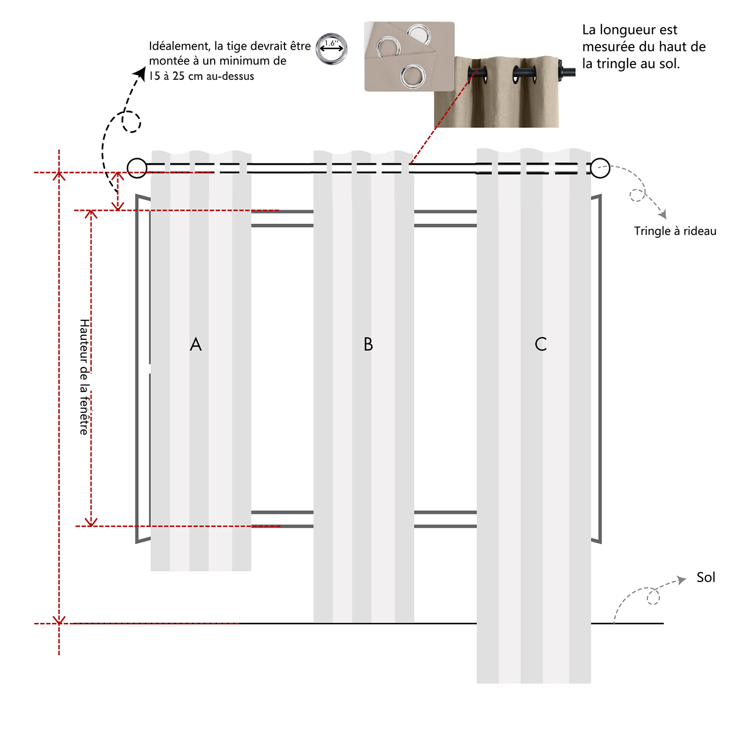 - Longueur par panneau = de l'anneau à l'œillet de la tringle à rideau jusqu'à la hauteur finale souhaitée