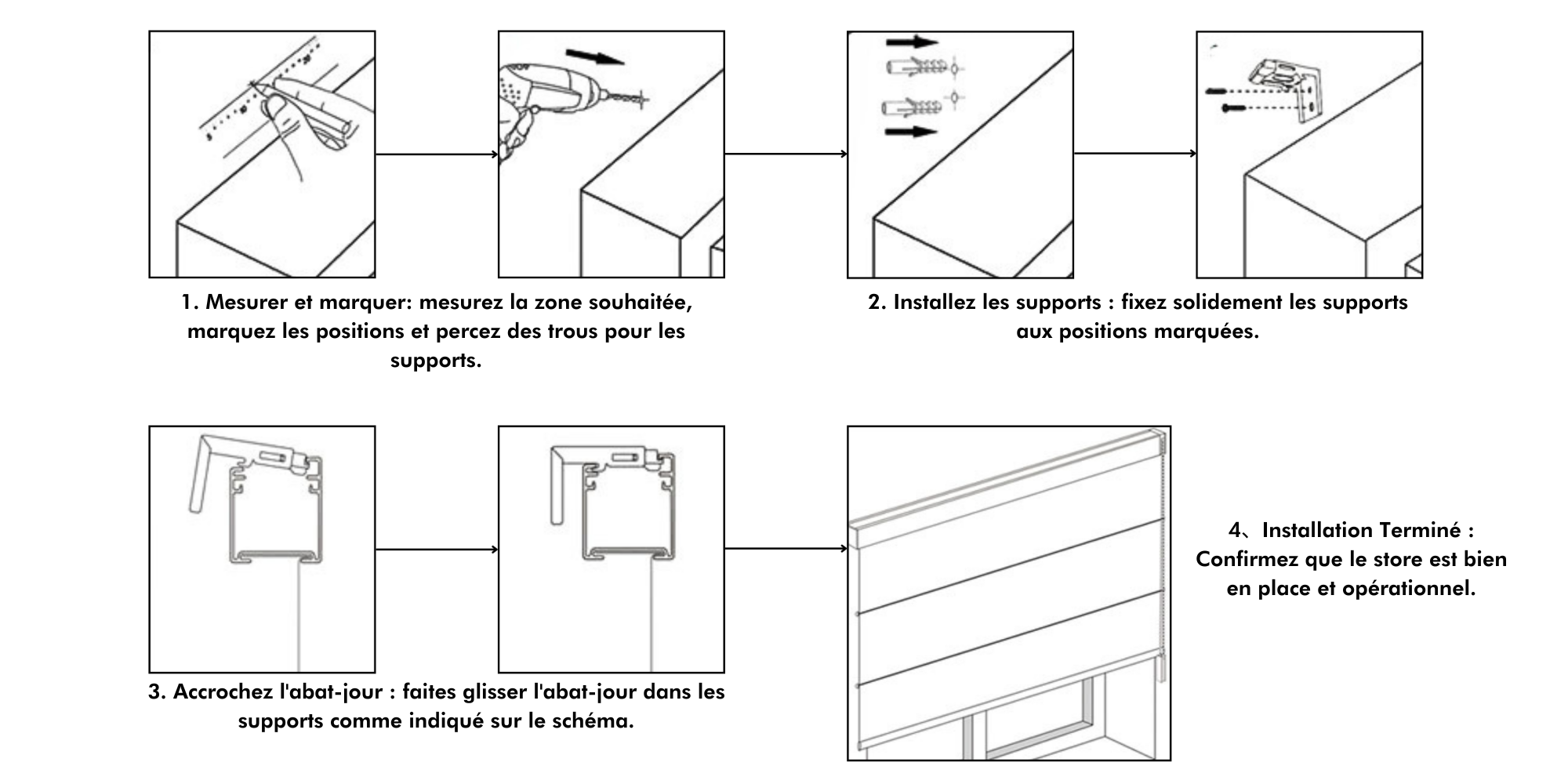 - Nous recommandons de commander une largeur supplémentaire de 10 CM à 15 CM pour éviter les espaces lumineux sur les côtés de votre fenêtre.