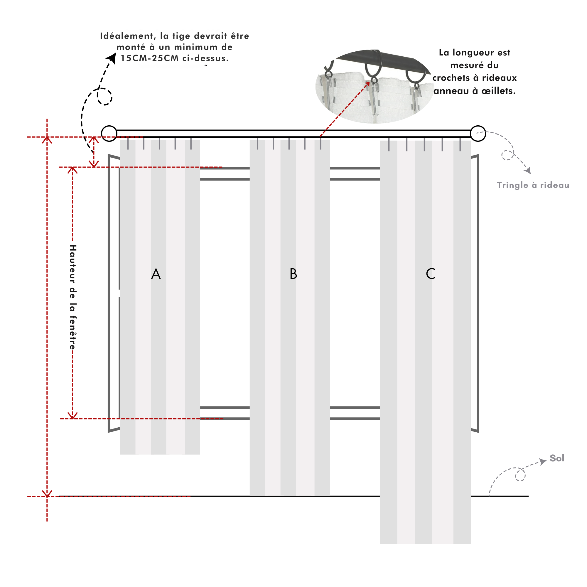 - Longueur par panneau = de l'anneau à l'œillet de la tringle à rideau jusqu'à la hauteur finale souhaitée
