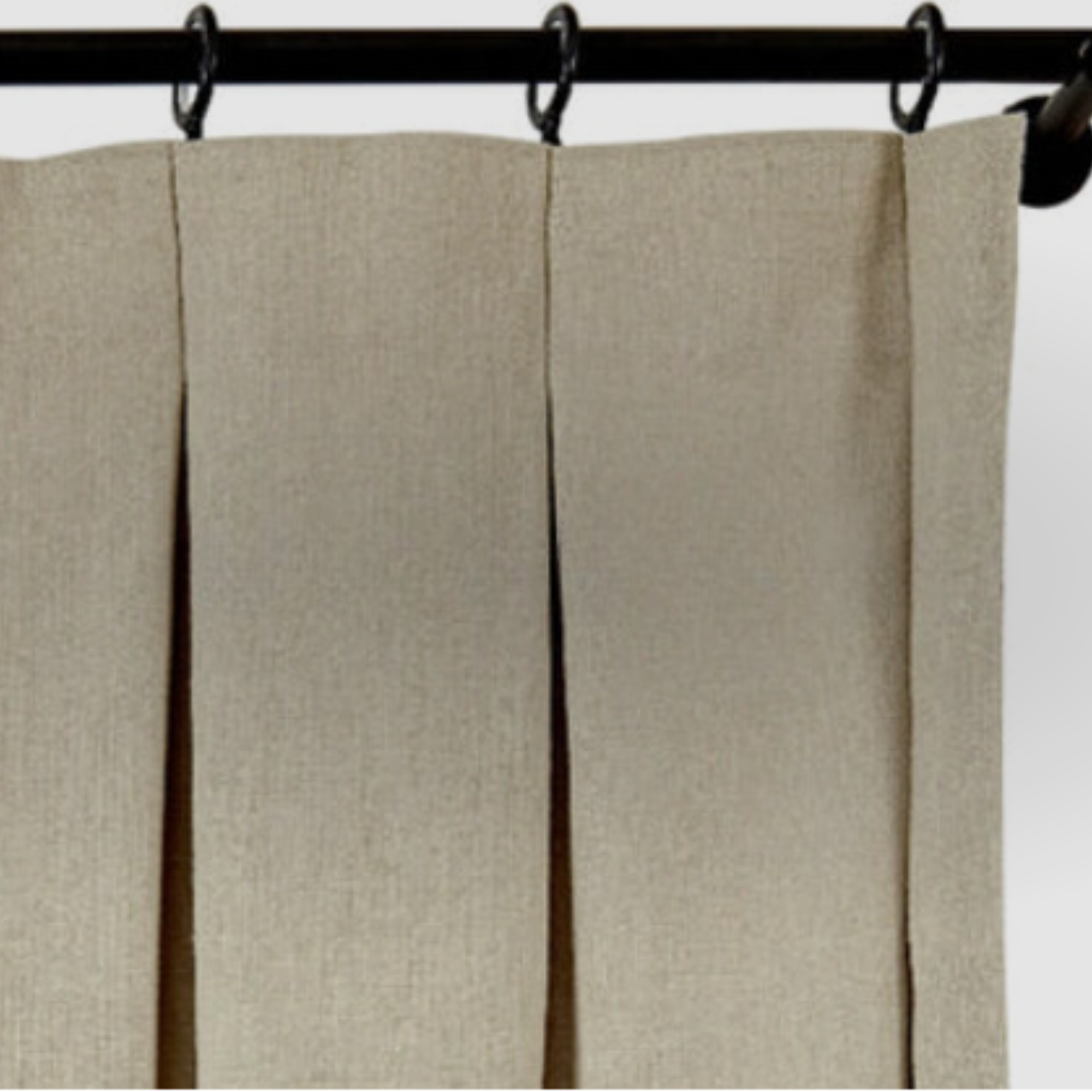 Pour les styles de tête plissée, comme le pli pincé, le pli tailleur, le pli inversé, la boîte à godets et le pli en ruban, si la longueur du rideau fini dépasse 275 cm, alors la largeur maximale du rideau fini sans couture est de 140 cm ; si la longueur du rideau est inférieure à 275 cm, aucune couture pour aucune largeur de rideau fini. Sinon, la largeur doit être double avec une couture verticale.
