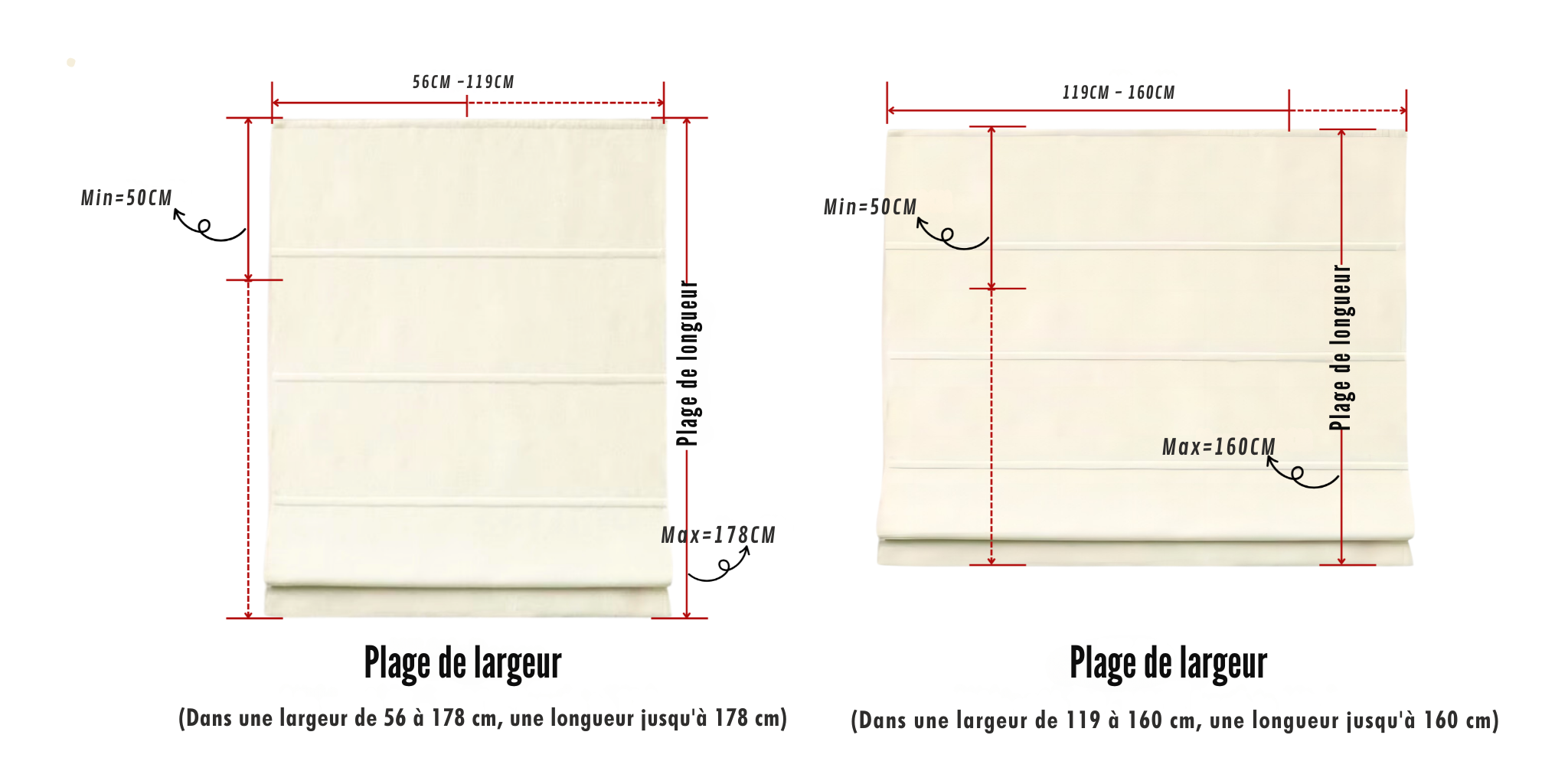- Nous recommandons de commander une largeur supplémentaire de 10 CM à 15 CM pour éviter les espaces lumineux sur les côtés de votre fenêtre.